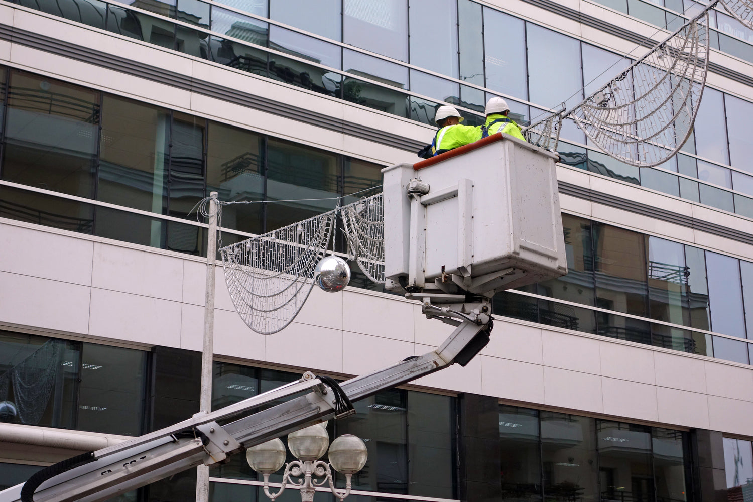 Festive lighting installation for commercial and residential properties. Create stunning holiday displays with our cherry picker services.